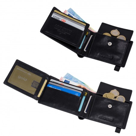 Mehrere Fächer für Karten und Banknoten.