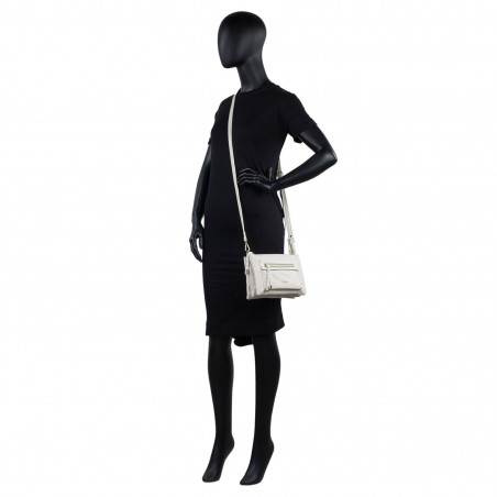 Closing with zipper. Front and back pockets with zipper. Adjustable and removable shoulder strap. Inner pocket with zipper.
