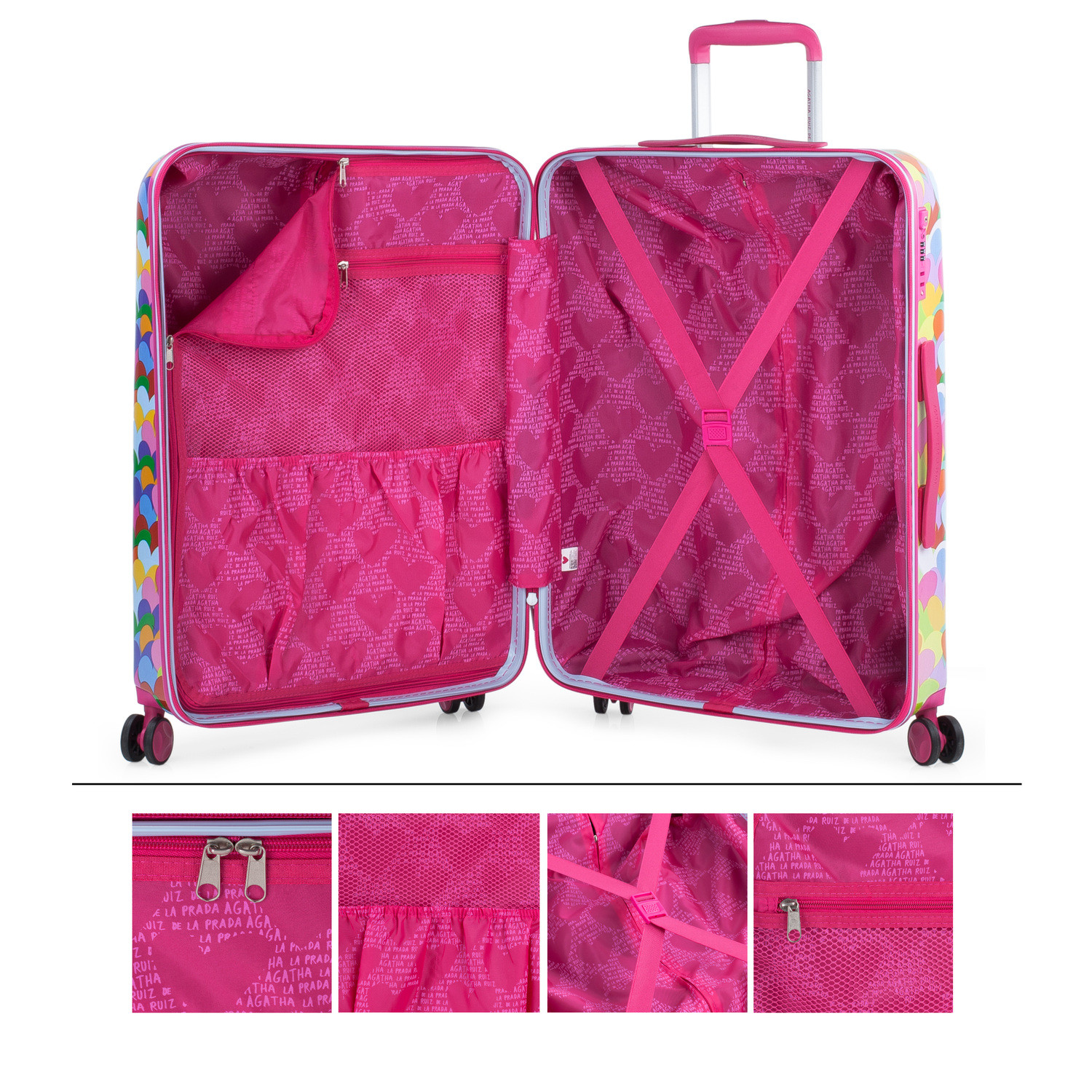Agatha Ruiz de la Prada is a renowned brand specialized in the manufacture of high quality suitcases and travel accessories. The CORAZONES COLORES collection is one of the brand s most popular lines, characterized by its elegant designs in dark tones and its resistant polyester material. The CORAZONES COLORES suitcases by Agatha Ruiz de la Prada offer a large capacity and comfort of use thanks to its four multidirectional wheel system and adjustable telescopic handle. In addition, they have a zipper closure and several internal compartments to keep your belongings organized and protected during your travels.