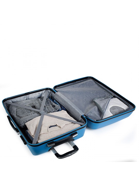 Maleta trolley tamaño 50 realizada con ABS, un material ligero y a la vez resistente. Otra ventaja es que permite mayor maniobrabilidad con sus 4 ruedas dobles giratorias 360° multidirección de suave rodamiento y su trolley telescópico con seguro hacen que su manejo sea más cómodo. Dispone de una cremallera con doble cursor y cerradura con combinación LOCK para una mayor seguridad. En su interior, contemplamos el forro personalizado de la marca, acorde al diseño exterior , con separación central. Contiene correas elásticas interiores que permiten la sujeción del contenido.