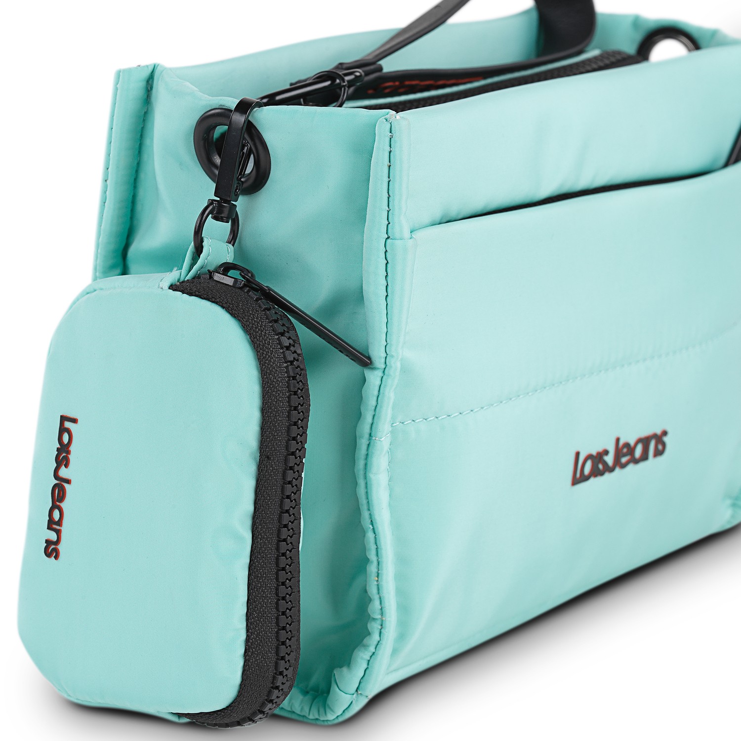 Points forts: le matériau, le logo sérigraphié en relief, le porte-monnaie suspendu qui va sur chaque article, le ruban personnalisé et le curseur principal avec fonction de poignée.