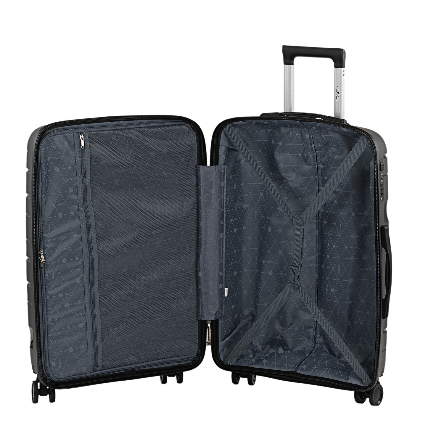 Valigia da viaggio con 4 ruote della ditta ITACA realizzata in Polipropilene PP. Abbiamo utilizzato polipropilene all avanguardia. Questo materiale è ultra resistente e super leggero, il miglior materiale sintetico per la produzione di valigie. Alta resistenza e durata. Combinazione ideale per lunghi viaggi. Sono le valigie più recenti e di altissima qualità prodotte da ITACA. l evoluzione del marchio ITACA continua a ricercare la migliore qualità al miglior prezzo. Questa valigia ti offre una soluzione ideale per tutti i tipi di viaggi, week-end, brevi e lunghi. Per omologare la valigia a livello internazionale, abbiamo incorporato la serratura TSA, in questo modo non avrai problemi in nessuna dogana del mondo. Caratteristiche principali: Dimensioni: Mediano: Totale: 45 x 67,5 x 30 cm. Capacità: 77 L. Peso: 4 kg. Fuori: Materiale: polipropilene PP testurizzato antigraffio e anti-ammaccatura. Lucchetto combinato TSA integrato a 3 cifre per una maggiore sicurezza e omo