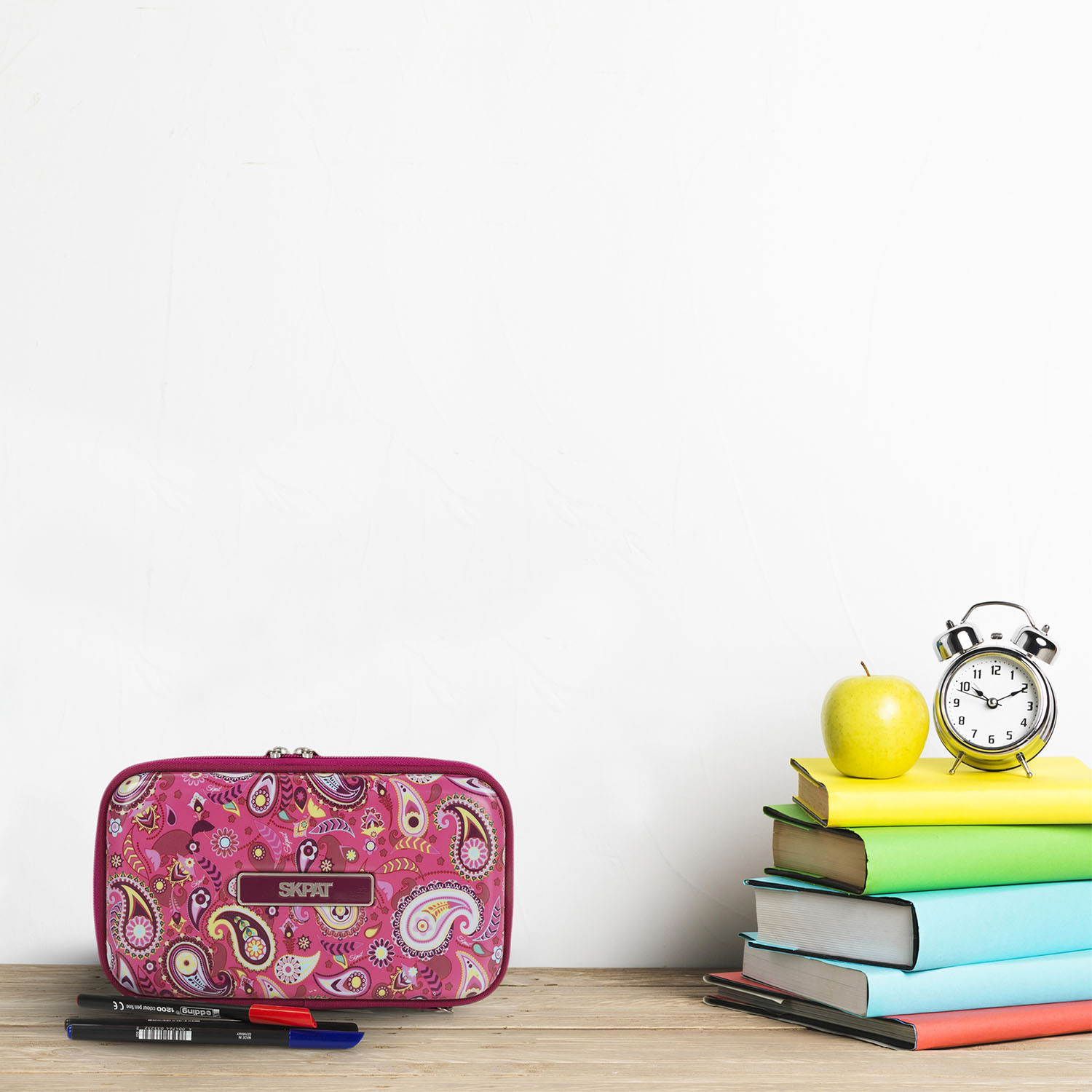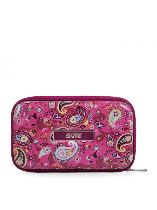 Titular rígido da marca SKPAT. O interior tem o forro personalizado da marca, juntamente com um bolso com zíper, lápis e porta-caneta e uma grade extra para armazenar os menores objetos. Medidas: 23 x 13 x 5,5 cm. Material: policarbonato.