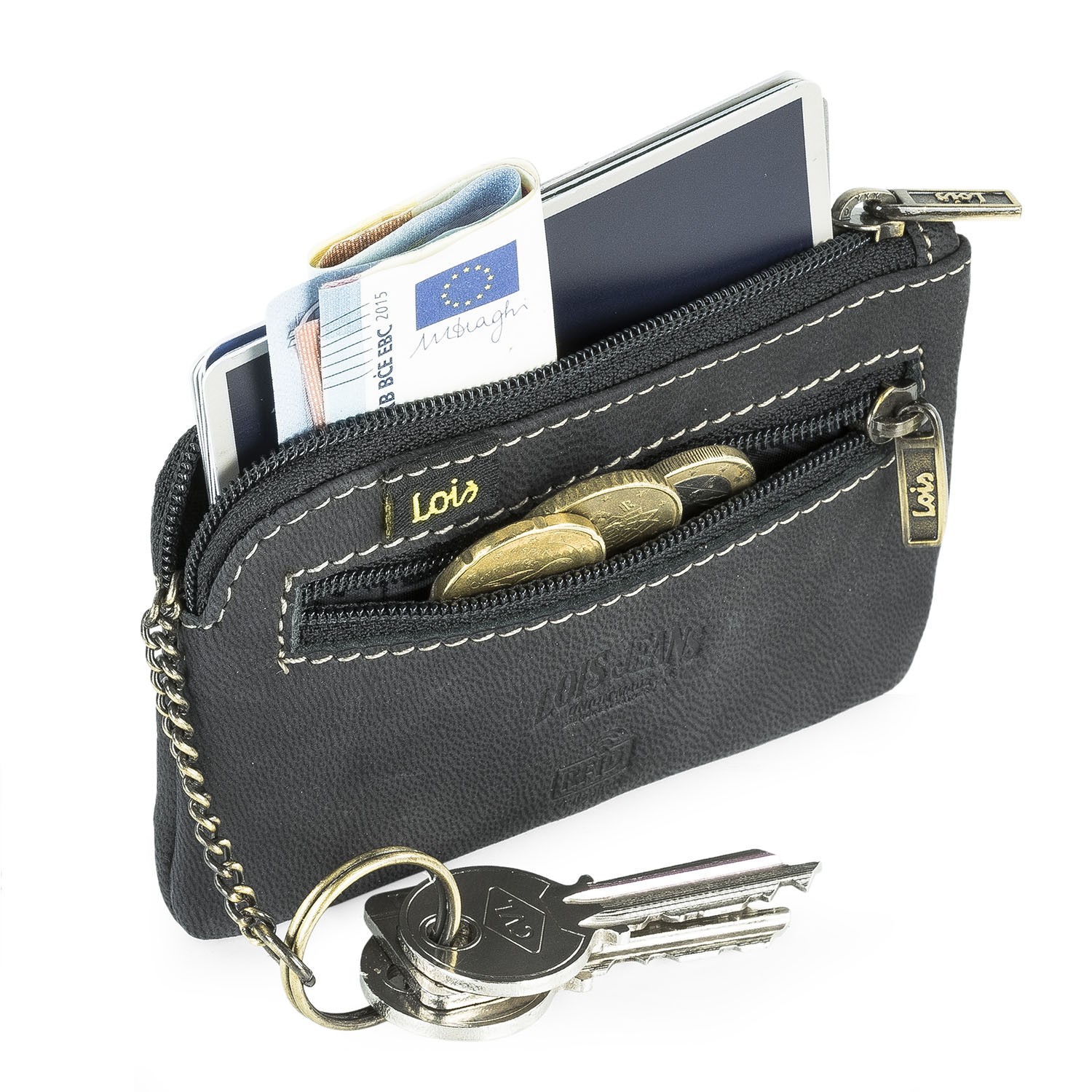 Bolsa de moedas com chaveiro de couro genuíno lois marca.